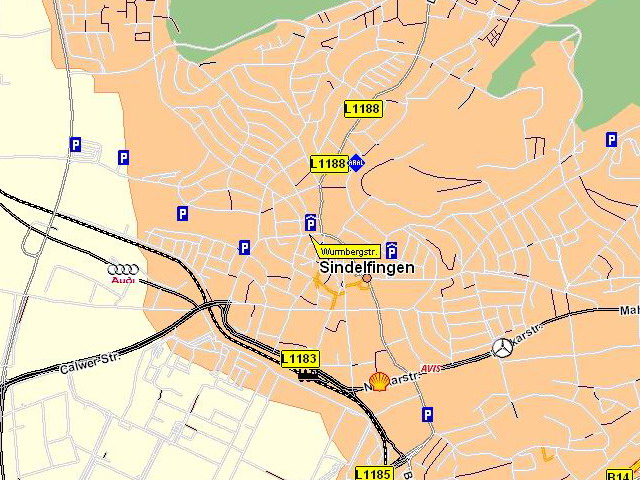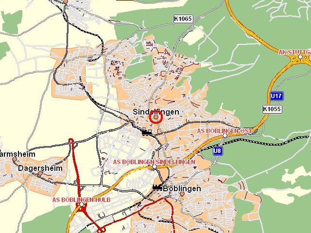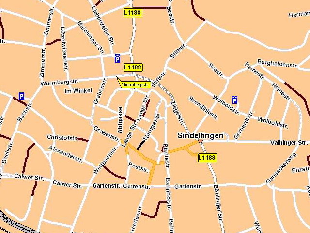immer geradeaus, in einer vorfahrtsberechtigen Linkskurve geradeaus in die Vaihingerstraße bis zum Marktplatz